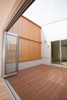 2Fデッキ材の隙間から1F中庭へと柔らかい陽が降りそそぎます。