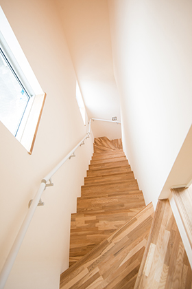 1F、2F、共に中庭を中心に配置する事により、すべての居住空間で「光・風」を感じることが出来ます。床材・階段・造作材すべてにオーク材を使用する事で、木の温もりに満ちた「ナチュラルモダン住宅」になっています。