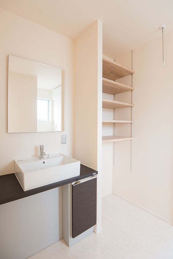 脱衣室の壁面は天井まで可動収納棚を取り付け、水回りをより快適に。