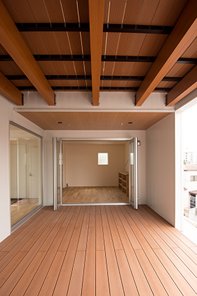 フルオープンサッシを開ける事で開放感が生まれ、いつの間にか家族の集う、20畳のフリースペースへとなります。
