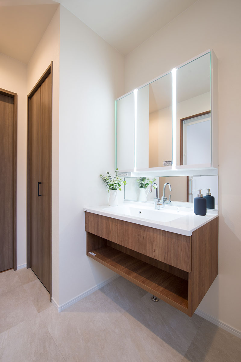 オシャレなフロートタイプの洗面化粧台。収納スペースを設け、使い勝手の良い洗面室となっております。