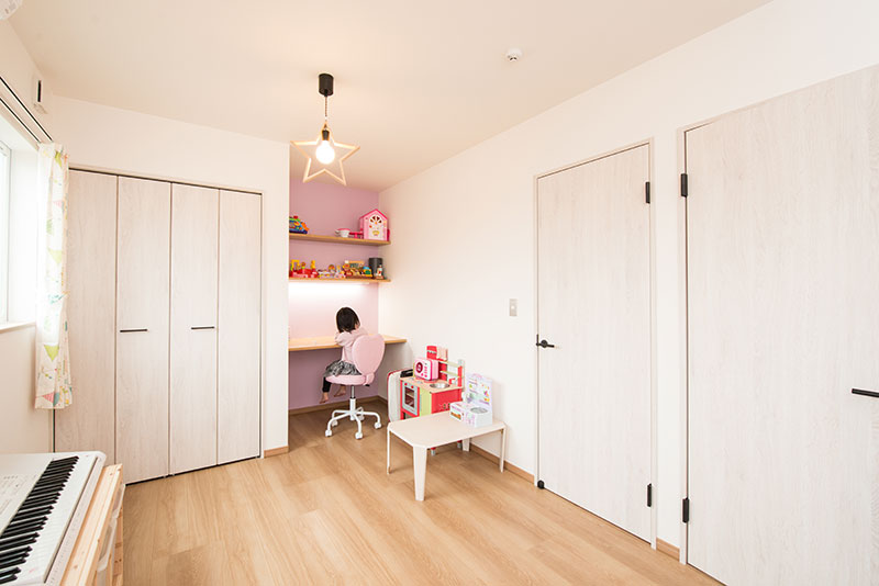 子供室、両サイドに机と本棚を造作。将来、間仕切壁を施工すれば二部屋になります。
