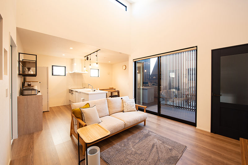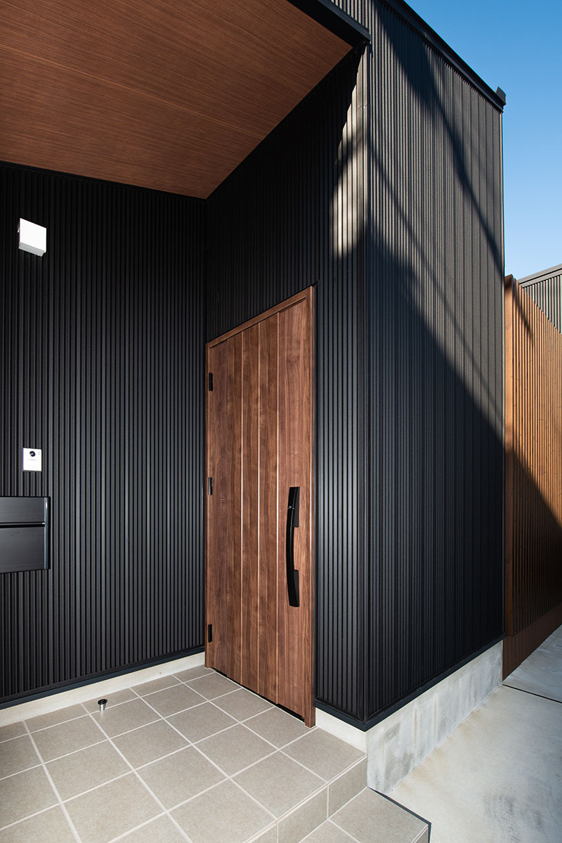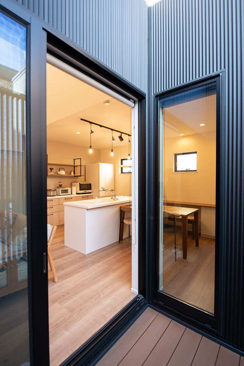 平屋+メタルサイディングご希望との事でしたので、広さに予算を掛けるのではなく、質感の良い素材に予算を掛ける事をベースにプランニングを進めさせて頂きました。 その中でもLDKに吹き抜けを設け、玄関、LDKに面して中庭を設置する事で、ご家族が集まる中心に光が差し込むようにプランニングさせて頂きました。 廊下を極限まで少なくする事で、延床面積以上の解放感も得る事ができたと実感しております。 WICに内窓を設け、アイロンをかけながら、LDKの気配を感じる。。。など