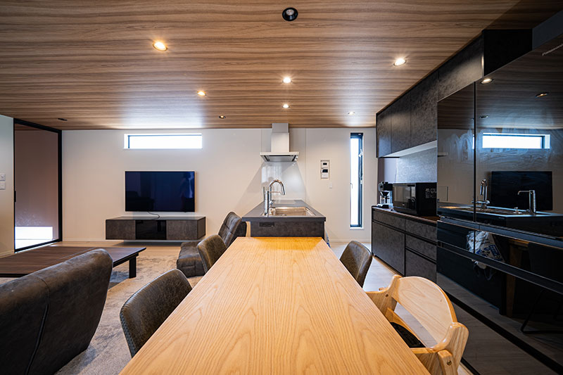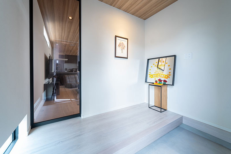 どこにお金を掛けて、どこで我慢するのかお家づくりの上で大変難しい問題ではありますが、ガレージをなくした分、玄関→LDK入口をハイタイプのガラス扉使用、LDKサッシ高さH=2400使用、スケルトン階段使用など、お家のイメージ印象を変える部分に予算を掛ける事ができました。お客様からのご提案のおかげでよりラグジュアリーモダンな雰囲気のお家になったと思います。