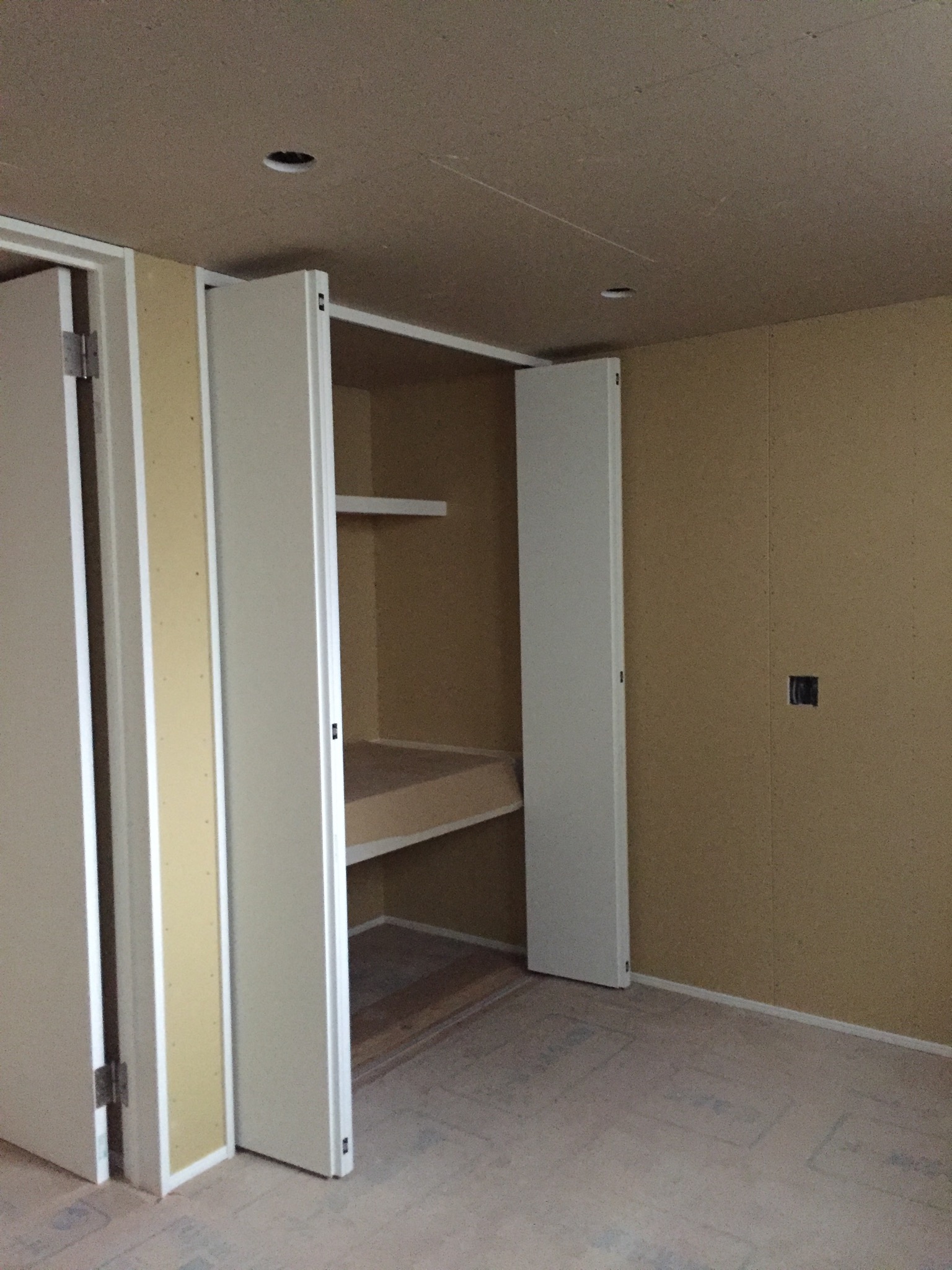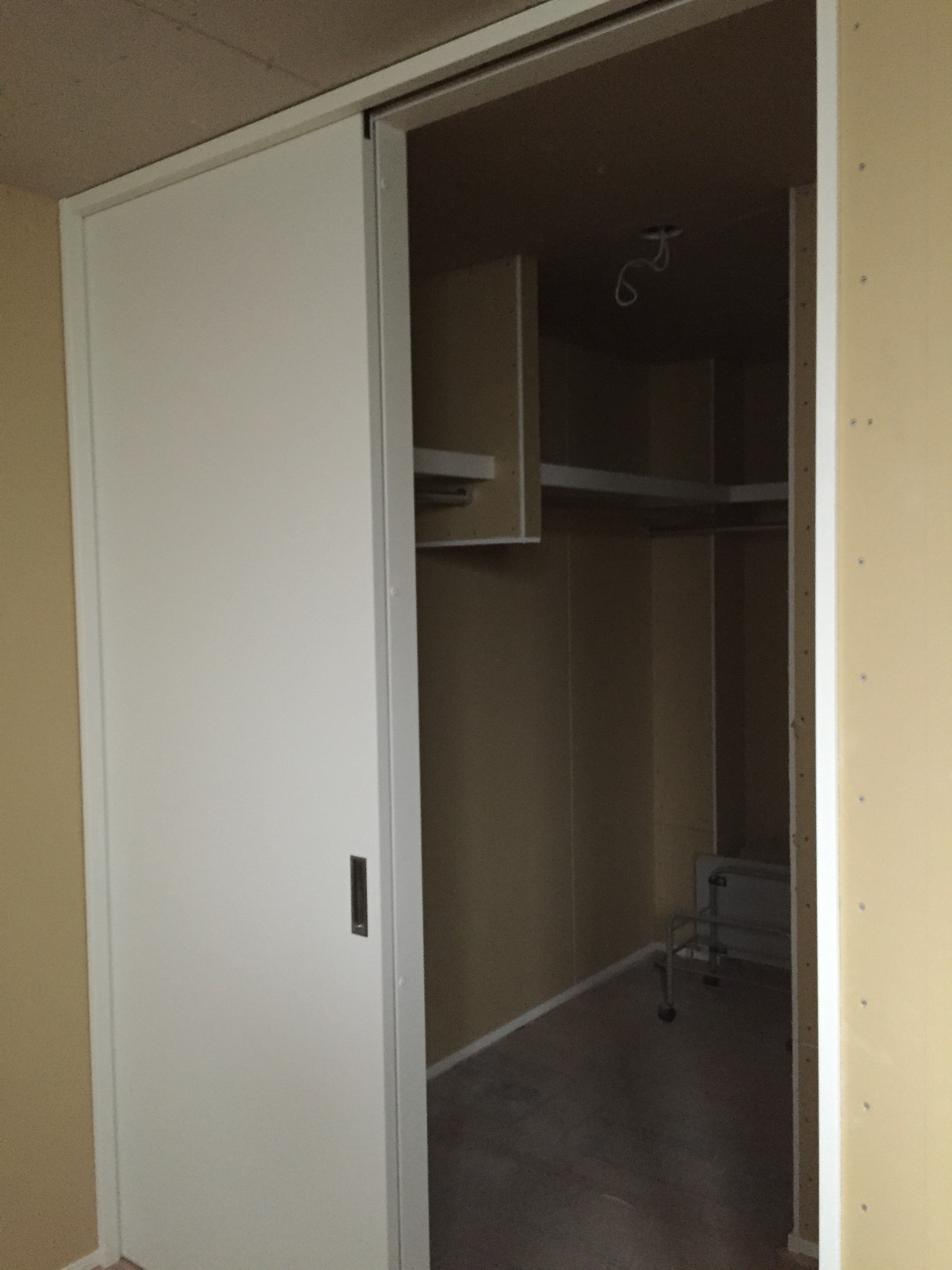 クロス屋さんにバトンタッチ前に、可動棚、中段、枕棚などの棚類を取り付けます。
