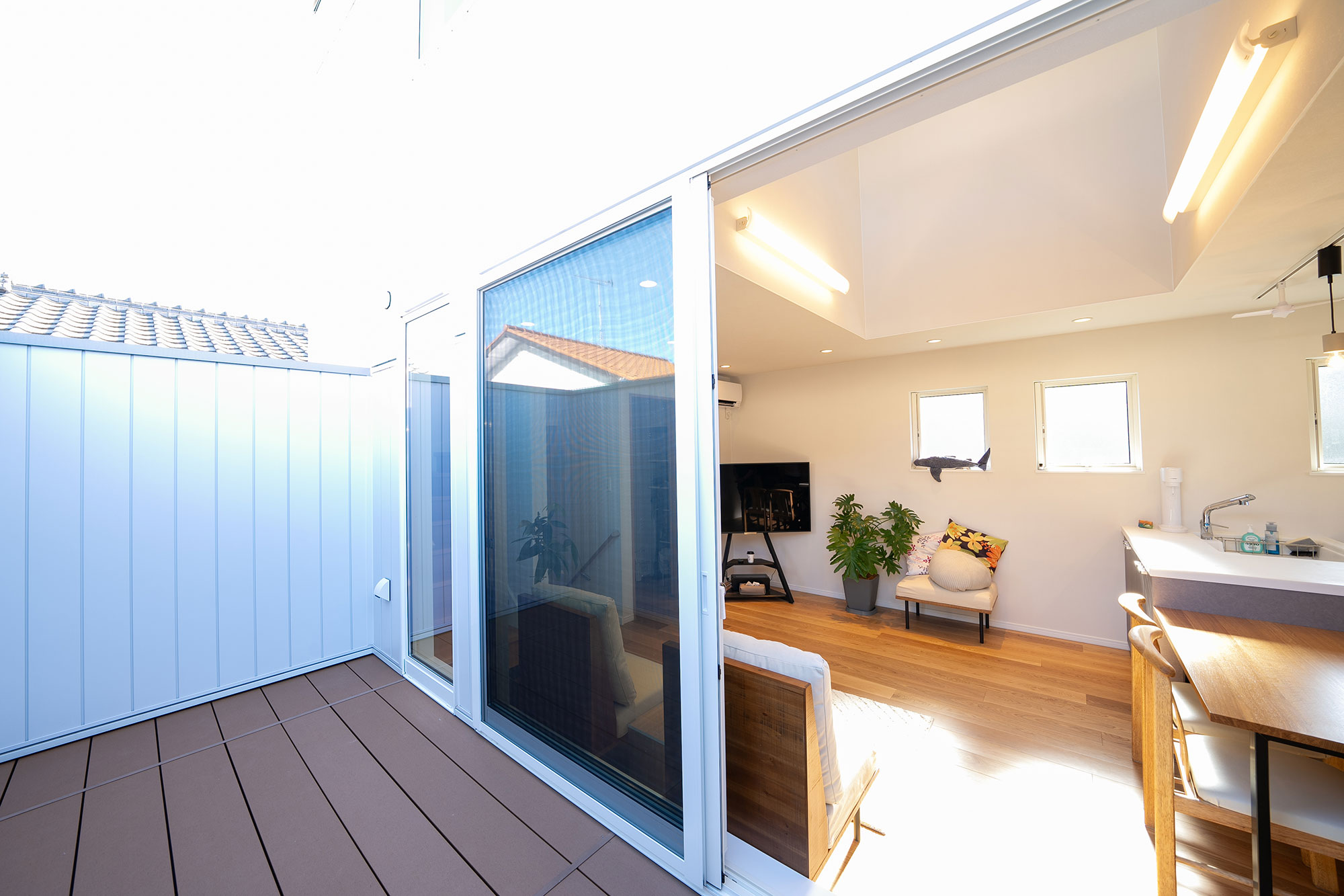 リビングから直接出入りできるため、キッチンに立ちながらでも中庭で遊ぶ子供の様子を安心して見守ることができます。