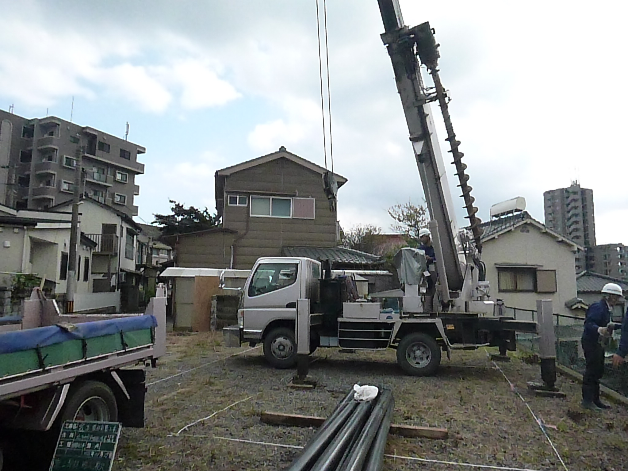 地盤調査結果はよかったのですが、崖条例対策の為、鋼管杭を打ちます。