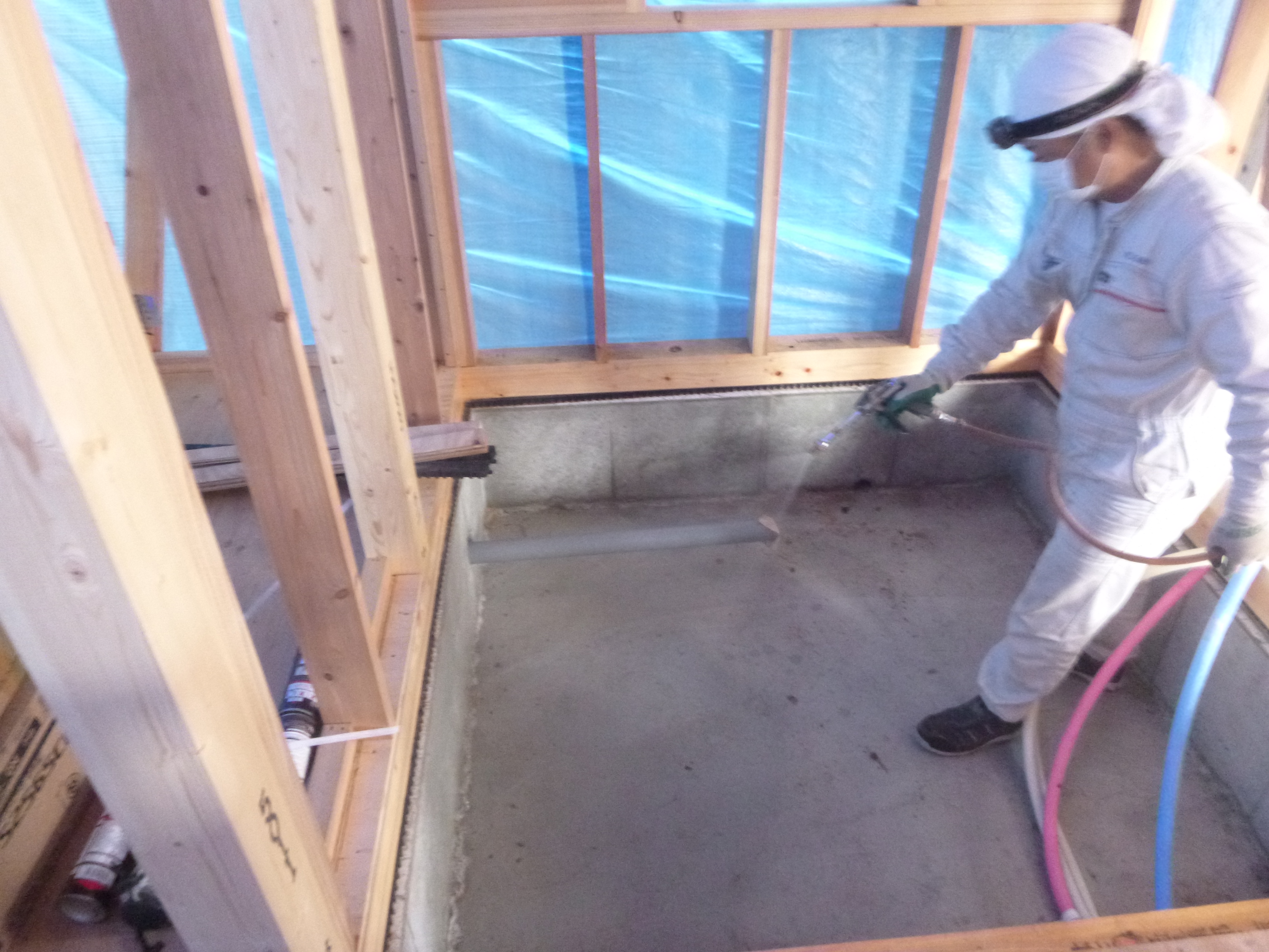 SBベタ基礎部に薬剤を吹き付けます。