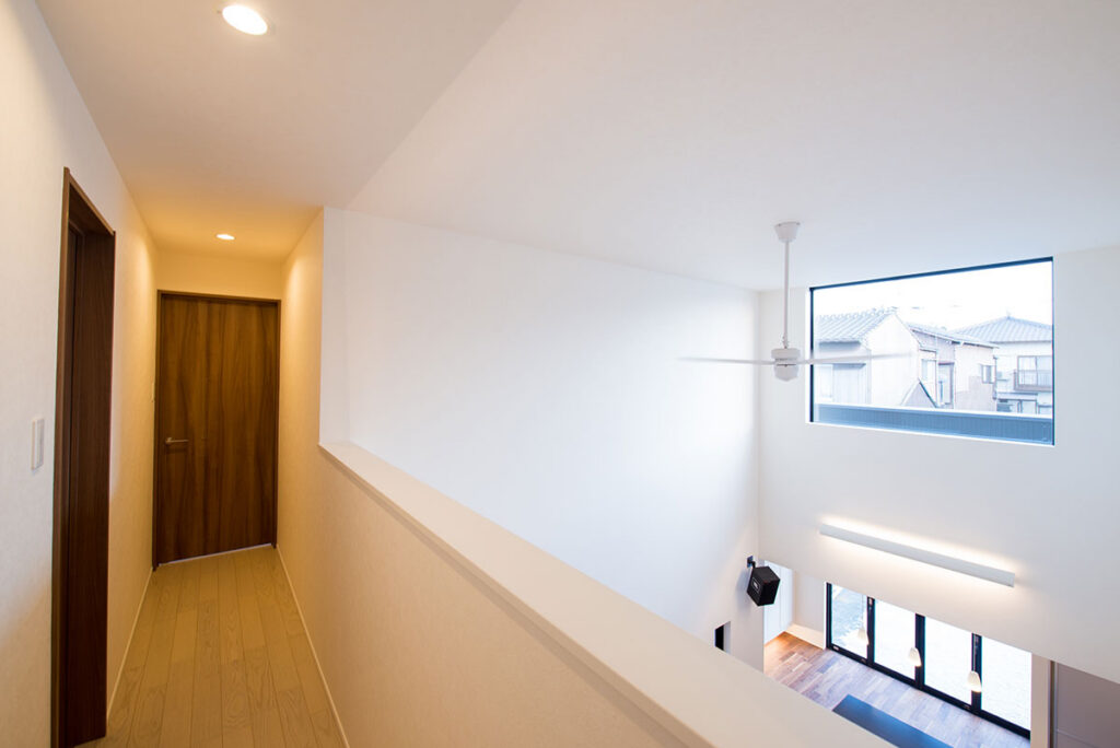 フルオープンサッシより「風」を、リビング上部吹抜より「光」を感じる事の出来る住宅です。黒を基調とした内装の中に「銘木フローリング」を使用する事でシックな中にも、木目の温かみをプラスした「くつろぎ空間」が広がっています。