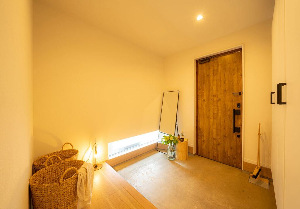 ナチュラルな木目が美しい、開放感のある玄関ホール。地窓から差し込む柔らかな光が足元を照らし、カゴや植物などの雑貨が映える、カフェのような心地よい空間がゲストを迎え入れます。