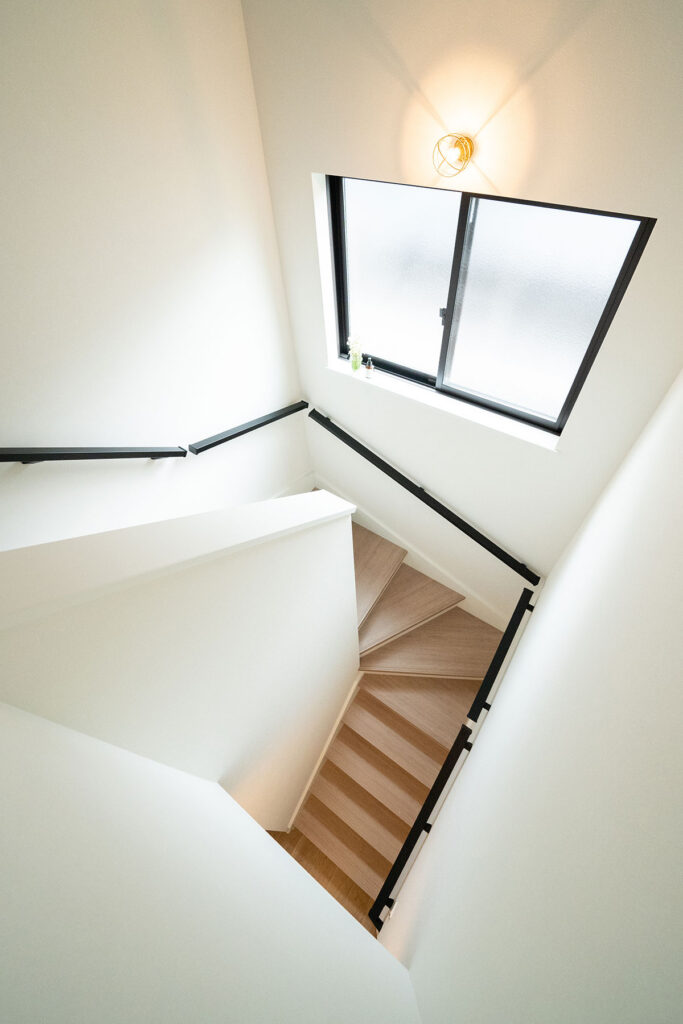 白の空間に黒のアイアン手すりが美しく映える、スタイリッシュな階段室。上部の窓から注ぐ光と温かなブラケットライトが、毎日の昇り降りを明るく爽やかに彩ります。
