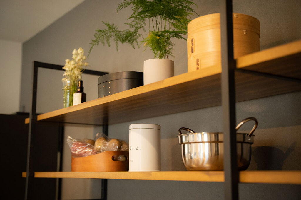 キッチンの背面を彩る、木とアイアンを組み合わせたオープンシェルフ。お気に入りの器やグリーンを並べて、自分らしい「カフェ風景」をデザインできる空間です。機能的な収納でありながら、暮らしに彩りと愛着を添えてくれます。