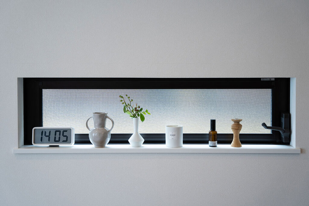 窓枠を飾り棚として活用した、カフェのようなニッチスペース。型ガラス越しの柔らかな光が、並べられた雑貨を優しく照らします。日常のふとした瞬間に心が和む、情緒豊かな設計です。