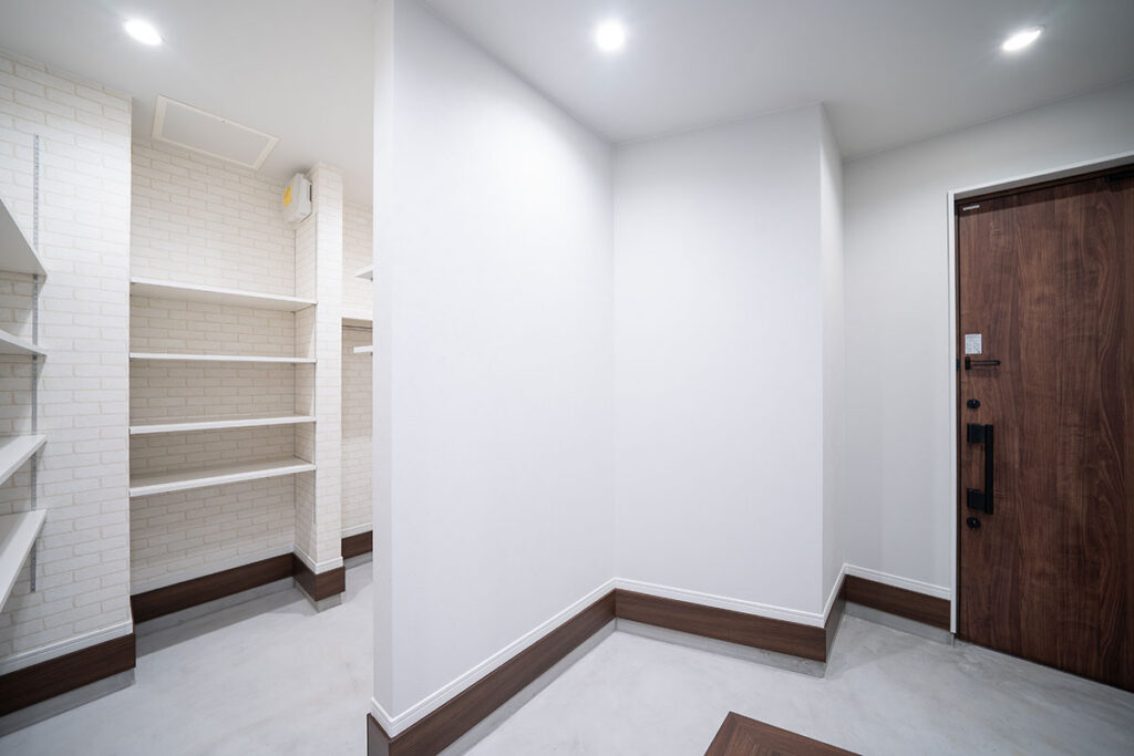 大容量の土間収納を備えた玄関。可動棚とレンガ調クロスで実用性と個性を両立しています。回遊性のあるウォークスルー動線により、表玄関を常に美しく保てるよう配慮した設計です。